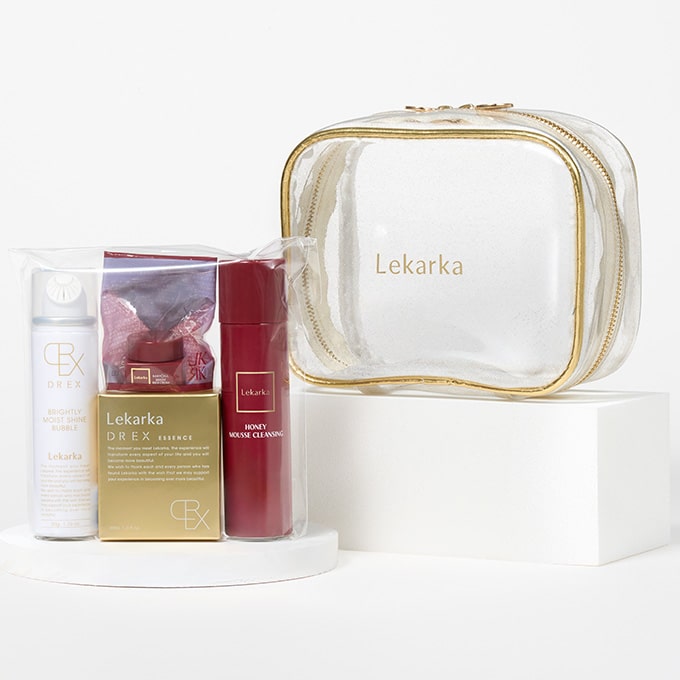 | 内容 | ・ハニームースクレンジング 40g (ミニサイズ) ・DREXブライトリーモイストシャインバブル 50g (ミニサイズ) ・DREXエッセンスS 30mL (現品) ・ブライトリッチクリーム 3g (ミニサイズ) ・クリアポーチ(サイズ:W170×H130×D70mm) |