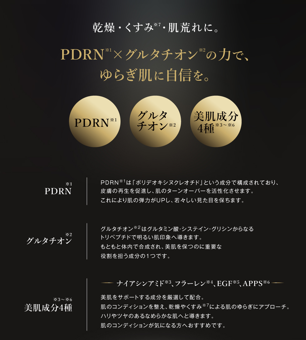 | 特徴 | 手のひらのミストで、乾燥リセット。うるおい、チャージ。 今注目のPDRN※1と、うるおいによる透明感ケアに着目したグルタチオン※2を配合したミスト状化粧水です。 ナイアシンアミド※3やフラーレン※4、EGF※5、APPS※6の美肌サポート成分も贅沢に配合。 乾燥や肌荒れ、くすみ※7が気になる肌をやさしく整え、ハリとツヤのあるうるおいに満ちた肌へ導きます。 毎日のスキンケアにも、外出先での乾燥対策にも。ふんわり香るベルガモットの香り。 |こんなお悩みに ・日中の乾燥が気になる ・肌荒れが気になる ・くすみ※が気になる 乾燥・くすみ※7・肌荒れに。 PDRN※1×グルタチオン※2の力で、ゆらぎ肌に自信を。 |PDRN PDRN※1は「ポリデオキシヌクレオチド」という成分で構成されており、 皮膚の再生を促進し、肌のターンオーバーを活性化させます。 これにより肌の弾力がUPし、若々しい見た目を保ちます。 |グルタチオン※2 グルタチオン※2はグルタミン酸_システイン_グリシンからなるトリベプチドで明るい肌印象へ導きます。 もともと体内で合成され、美肌を保つのに重要な役割を担う成分の1つです。 |美肌成分4種※3 ~※ 6 ナイアシンアミド※3、フラーレン※4、EGF※5、APPS※6を配合 美肌をサポートする成分を厳選して配合。 肌のコンディションを整え、乾燥やくすみ※7による肌のゆらぎにアプローチ。 ハリやツヤのあるなめらかな肌へと導きます。 肌のコンディションが気になる方へおすすめです。 パラベンフリー、鉱物油フリー、小麦由来原料フリー、合成着色料フリー、合成香料フリー ※1:DNA-Na(整肌成分)※2:グルタチオン(整肌成分)※3:ナイアシンアミド(整肌成分)※4:フラーレン(整肌成分)※5:ヒト遺伝子組換オリゴベプチドー1(整肌成分) ※6:バルミチン酸アスコルビルリン酸3Na(整肌成分)※7:乾燥により暗く見える肌印象のこと |