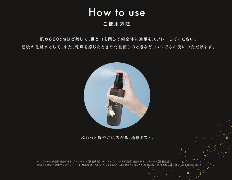 | ご使用方法 | 肌から20cmほど離して、目と口を閉じて顔全体に適量をスプレーしてください。