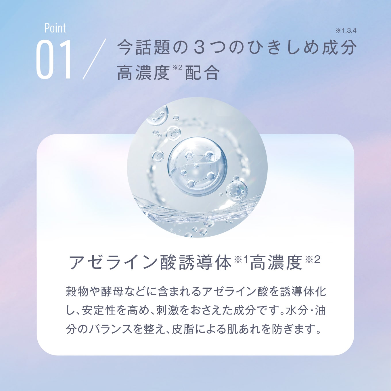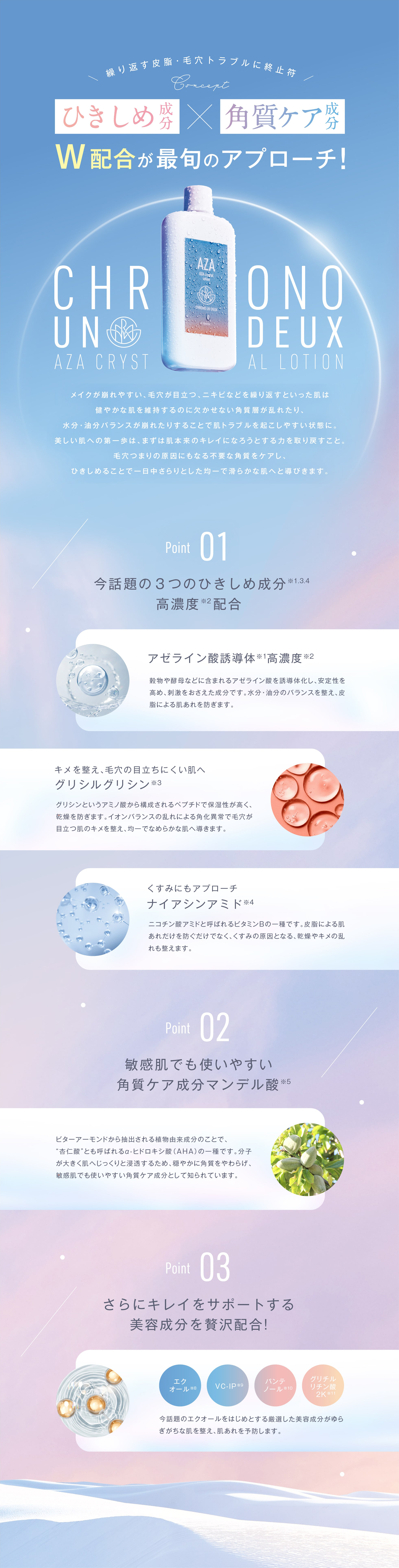 美容クリニックの最前線をホームケアに。 皮脂や毛穴トラブルが気になる肌に、3つのひきしめ成分と角質ケア成分を配合した化粧水です。高濃度※2アゼライン酸誘導体※1をはじめとする3つのひきしめ成分アゼライン酸誘導体※1、グリシルグリシン※3、ナイアシンアミド※4が肌の油分・水分のバランスを整えながら、肌をひきしめて、毛穴の目立ちにくいなめらかな肌へ整えます。マンデル酸※5が不要な角質に穏やかに働きかけ、ざらつきのない均一な美しい肌へと導きます。 ※1 アゼロイルジグリシンK、水(整肌成分)、※2 取り使い製品比において、※3 グリシルグリシン(整肌成分)、※4 ナイアシンアミド(整肌成分)、※5 マンデル酸(整肌成分) |