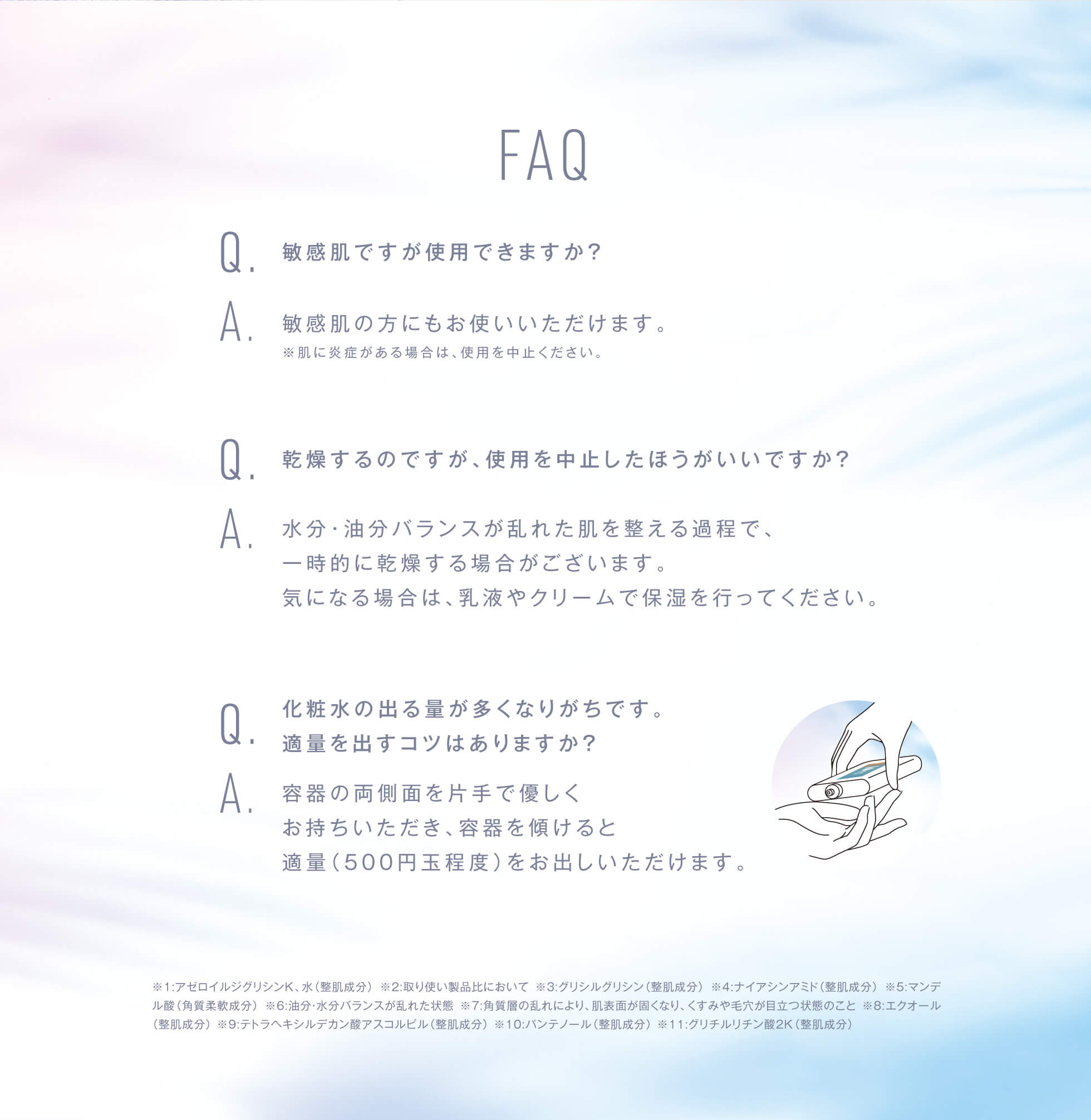 | 成分 | 水、ペンチレングリコール、BG、ナイアシンアミド、パンテノール、アゼロイルジグリシンK、グリシルグリシン、グリチルリチン酸2K、(アスコルビル/トコフェリル)リン酸K、セバシン酸、10-ヒドロキシデカン酸、1,10-デカンジオール、アラントイン、テトラヘキシルデカン酸アスコルビル、トロメタミン、マンデル酸、DPG、PEG-32、PEG-75、EDTA-2Na、PPG-6デシルテトラデセス-30、エクオール、PEG-60水添ヒマシ油、クエン酸、クエン酸Na、フェノキシエタノール、1,2-ヘキサンジオール |